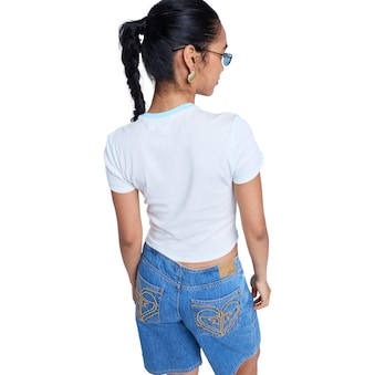 Kürzeres T-Shirt für Frauen. Die Eigenschaften dieses Produkts sind: Material: Flachripp-Walkfrottier [250 g/m²], Passform: Regular Cropped Fit, Hals: Rundhalsausschnitt und Siebdruck auf der Vorderseite.