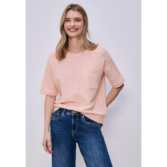 Strick auf die leichte Art. Das locker geschnittene Kurzarm-Shirt von SENSES.THE LABEL setzt auf Struktur. Es ist mit überschnittenen Schultern gestaltet, ein Elastiksaum akzentuiert den modernen Oversized Fit. Das Strickshirt passt hervorragend zu weiten Hosen und es liebt das Ton-in-Ton-Spiel. Das Model ist 180 cm groß und trägt Gr. XS/S.