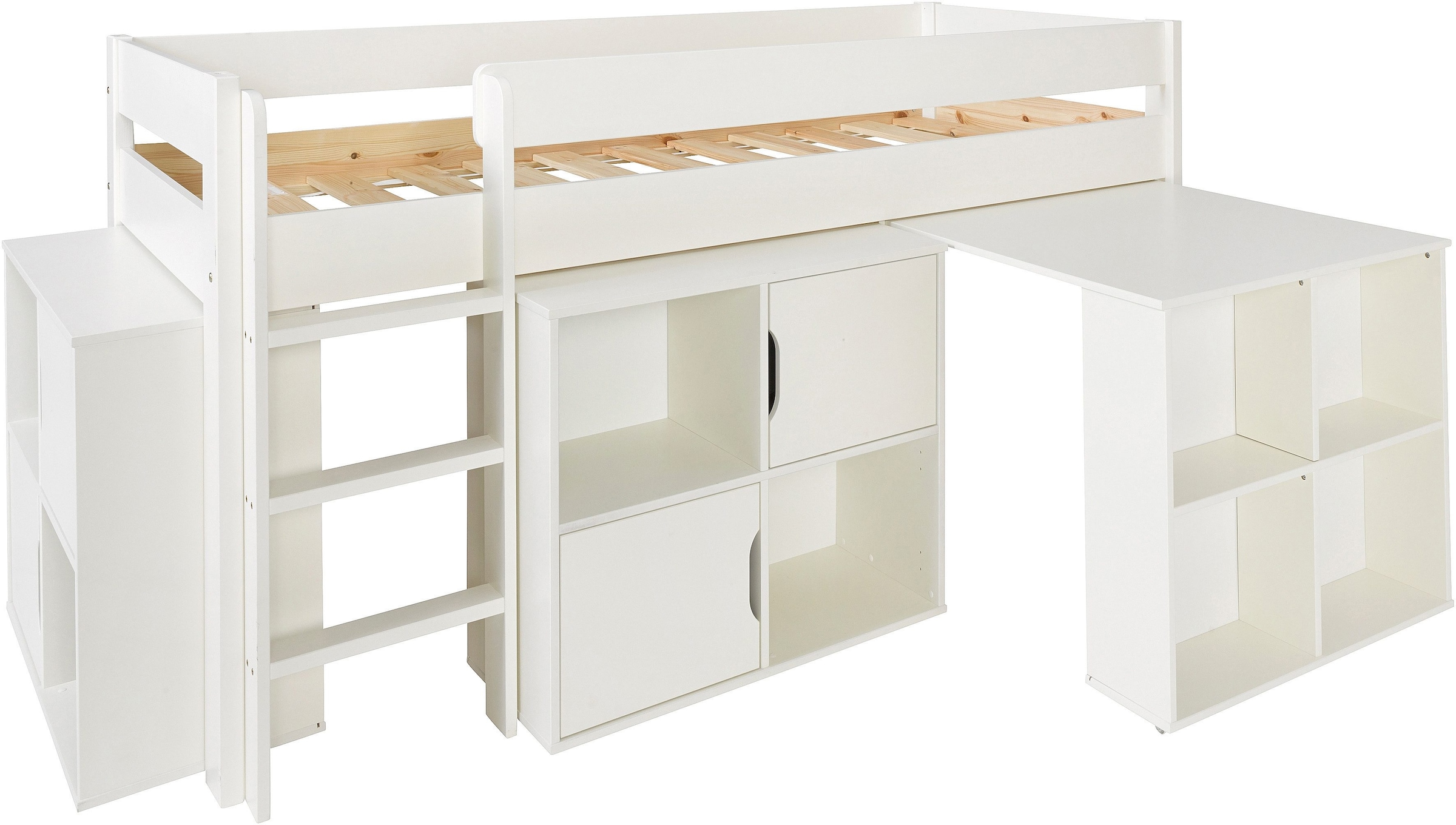 Lüttenhütt Hochbett »"ROBIN " Massivholz, viel Stauraum, seitenverkehrt montierbar« (4-tlg.), inklusive Schreibtisch und zwei Kommoden