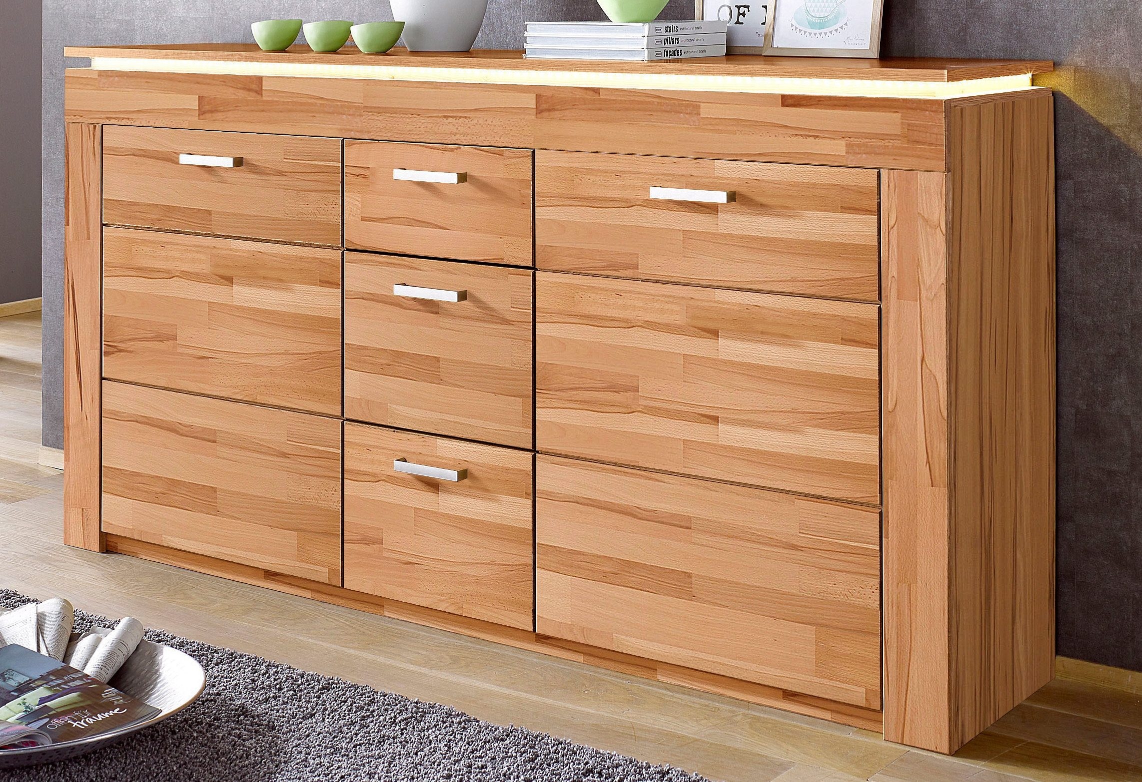 Wissenswertes | Sideboard mit einer Front aus Massivholz und einem Korpus aus Kunststoff Nachbildung. Links und rechts befindet sich jeweils eine Holztür mit je zwei Einlegeböden. Mittig drei Schubkästen auf Metallführung. Oberplatte mit Schattenfugen für LED-Stripes. In folgenden Farben erhältlich: