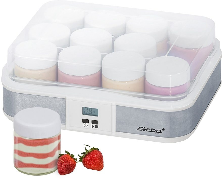 Der Joghurtmaker JM 2 von Steba bietet mit seinen 12 Glas-Joghurtbechern die Möglichkeit Joghurt für die Ganze Familie zuzubereiten. Das entspricht einem Gesamtvolumen von 2,4 Litern! Der fertige Joghurt lässt sich anschließend problemlos im Kühlschrank aufbewahren und bleibt durch den Deckel mit Schraubverschluss lange frisch. Auch die Reinigung ist in der Spülmaschine eine Kinderspiel.