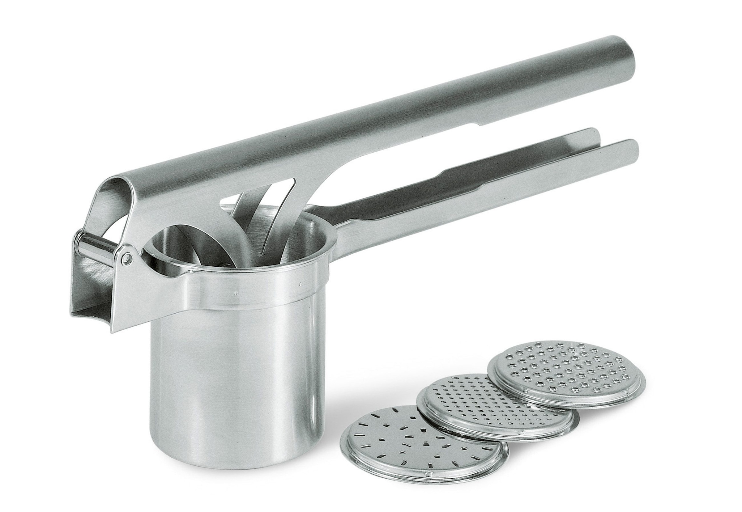 GEFU Kartoffel- und Spätzle-Presse, »TRI STAR«. Das sehr stabile Gerät mit dem starken Presshebel macht das Arbeiten leicht und professionell. Die Lochscheiben rasten gut ein und sind schnell und bequem auszuwechseln. Mit 3 auswechselbaren Lochscheiben für professionelle Handhabung und vielfältige Anwendung. Mit 2,5 mm Lochung zum Pürieren von Kartoffeln, Gemüse und Obst, mit 3,0 mm Lochung als Düse für lange Spätzle und Spaghetti-Eis und mit Speziallochung für Spätzle, die aussehen wie handgeschabt. Edelstahl 18/10, mit 3 auswechselbaren Scheiben, Lochung 2,5mm, 3mm und Speziallochung, Spülmaschinengeeignet.