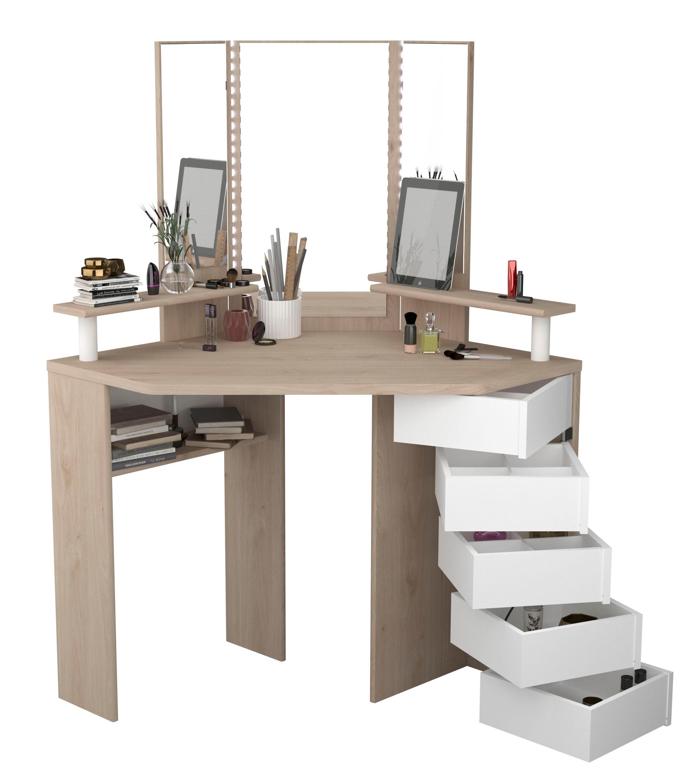 - Dreiteiliger Spiegel mit integrierter LED-Beleuchtung sorgt für gute Sicht beim Schminken