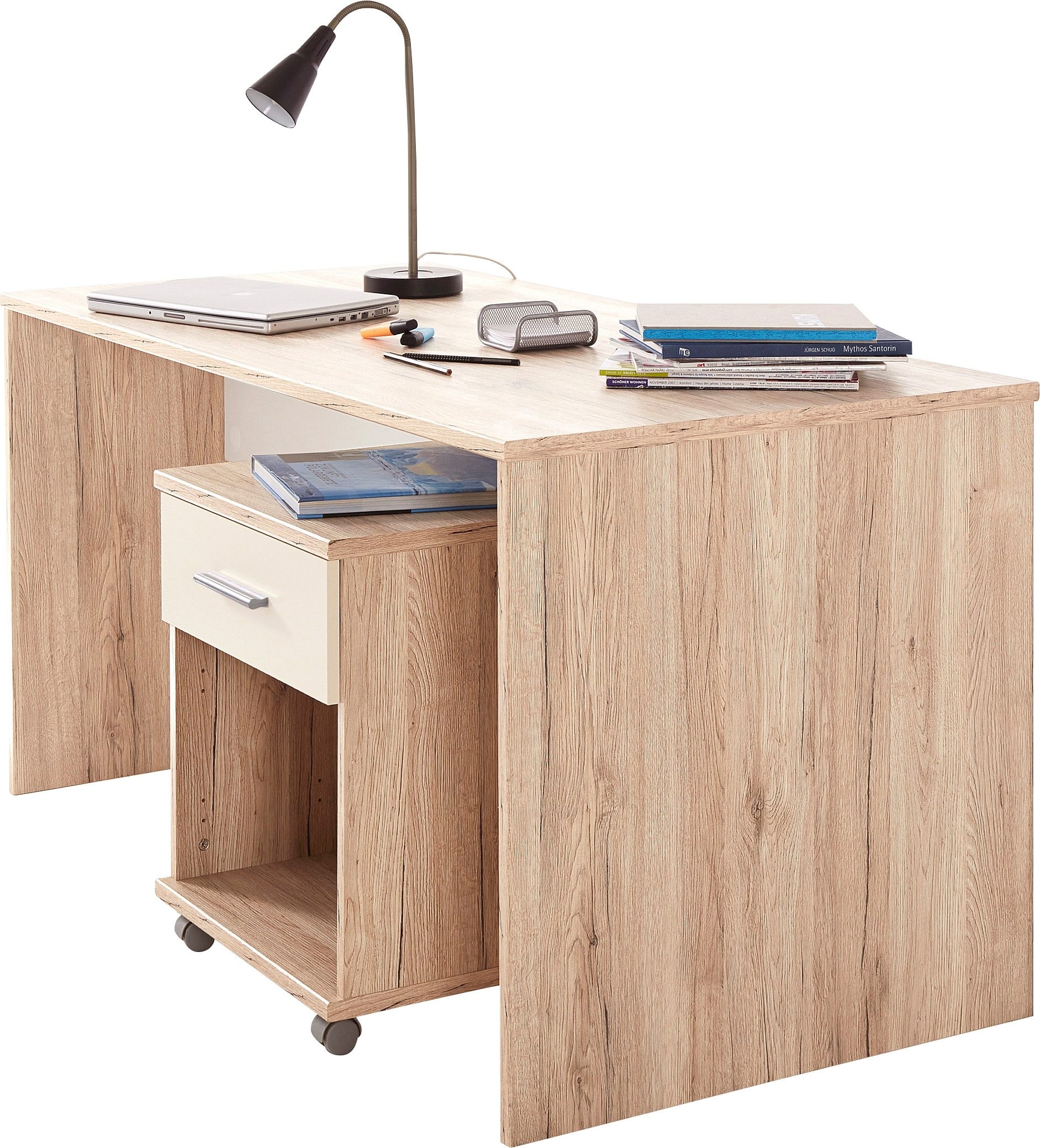 Der natürlich wirkende Schreibtisch »Jork« in toller Holzoptik ist das passende Möbelstück für jedes Jugendzimmer. Er bietet ausreichend Platz zum Arbeiten, Lesen, Lernen oder für die Ausübung von verschiedenen Hobbys. Ein separat bestellbarer Rollcontainer sorgt dabei für den entsprechenden Stauraum. Durch das klare, schlichte Design des Arbeitstisches fügt er sich mühelos in das gegebene Wohnkonzept ein.
