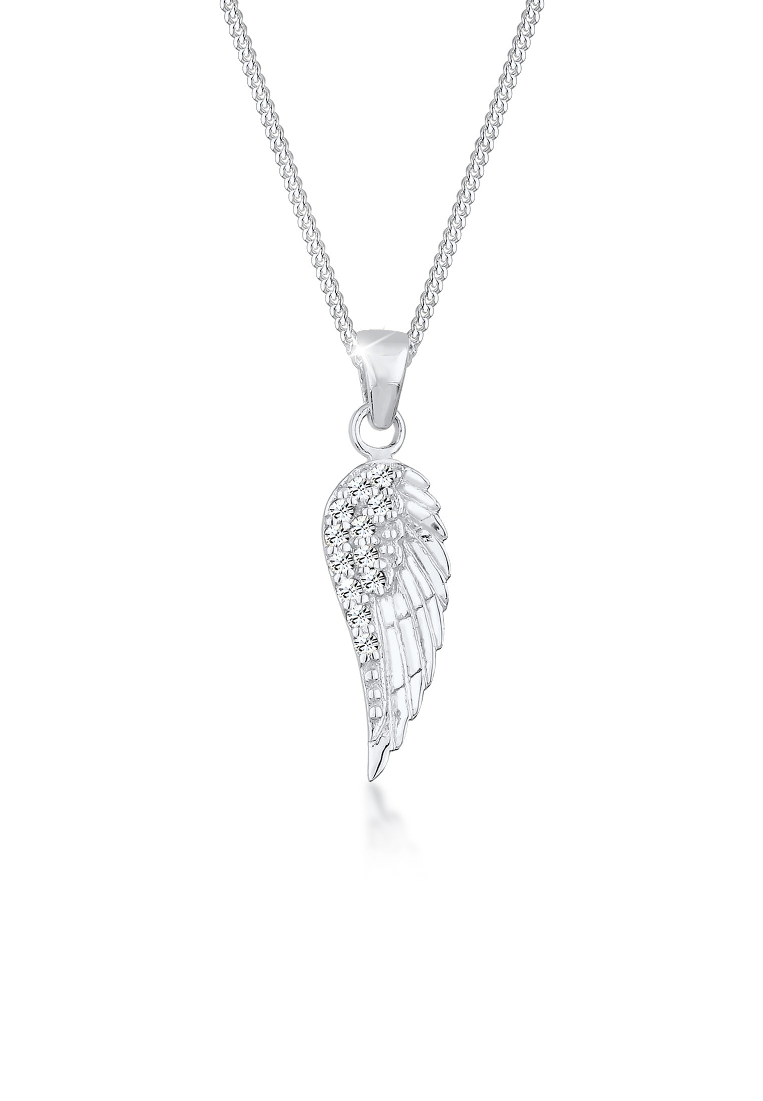 Glamourös funkelt diese modische 45 cm lange Halskette aus feinstem 925 Sterling Silber und veredelt mit Swarovski® Kristallen. Der Halsschmuck mit Flügel Symbol umspielt elegant den Hals ihrer Trägerin und verleiht jedem Outfit einen feminin verspielten Look mit dezenter Extravaganz. Verschenke den liebevollen Halsschmuck oder trage ihn als romantischen Talisman selbst.