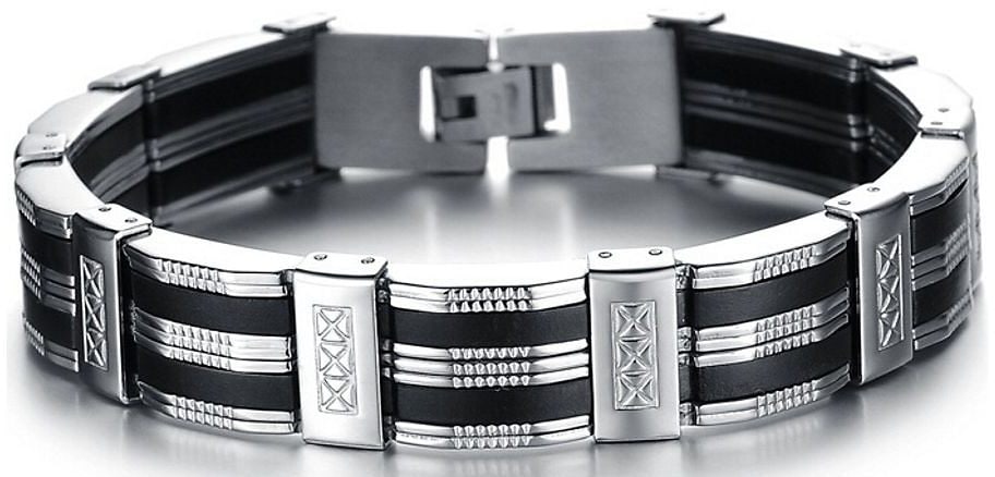 Das elegante Edelstahlarmband überzeugt durch die strukturierte, gegliederte Optik, die das Accessoire zum maskulinen Must-Have macht. Die schwarzen Silikon Streifen runden den Look des Herrenschmucks ab.