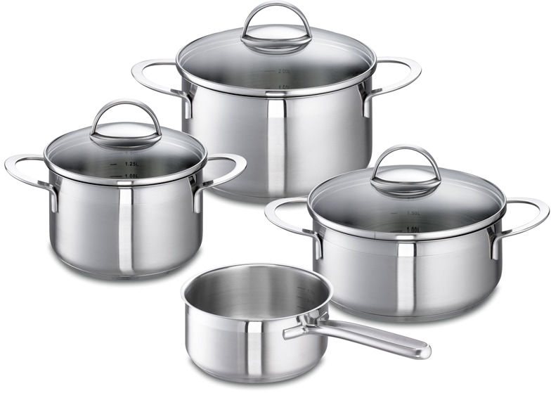 Die schlichte Eleganz des 4-teiligen Topf-Set »Wave« wird ergänzt durch die hohe Funktionalität der einzelnen Artikel. Wärmeisolierende Profigriffe werden auch nach längerem Kocheinsatz nicht heiß und der rostfreie Edelstahl verleiht Ihren neuen Küchenbegleitern das besondere, schicke Etwas.