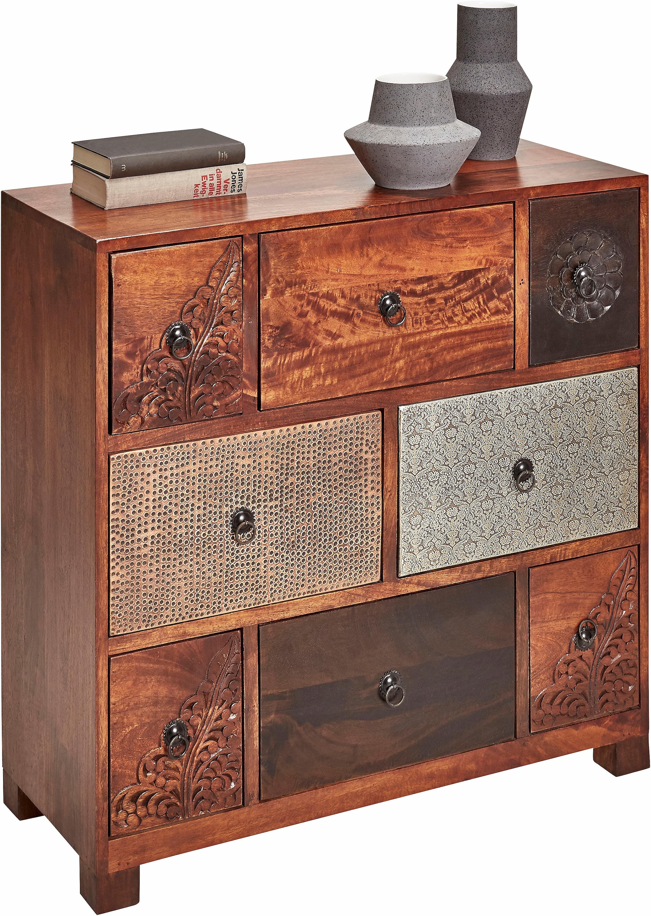 Wissenswertes | Kommode aus FSC®-zertifizierter, massiver Akazie. Mit geschnitzten und Hammerschlag-Metallfronten in schwarz, silber oder kupfer. Handgefertigt, daher ist jedes Stück ein Unikat. Mit 8 Schubkästen. Maße (B/T/H): 85/35/85 cm. Fußhöhe 5 cm. In folgenden Farben erhältlich: