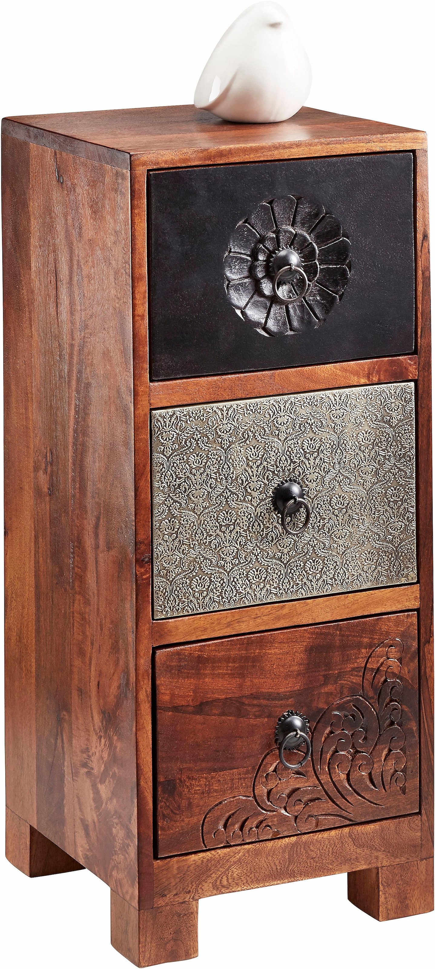 Wissenswertes | Kommode aus FSC®-zertifizierter, massiver Akazie. Mit geschnitzten und Hammerschlag-Metallfronten in schwarz, silber oder kupfer. Handgefertigt, daher ist jedes Stück ein Unikat. Mit 3 oder 4 Schubkästen. Fußhöhe 5 cm. In folgenden Farben erhältlich:
