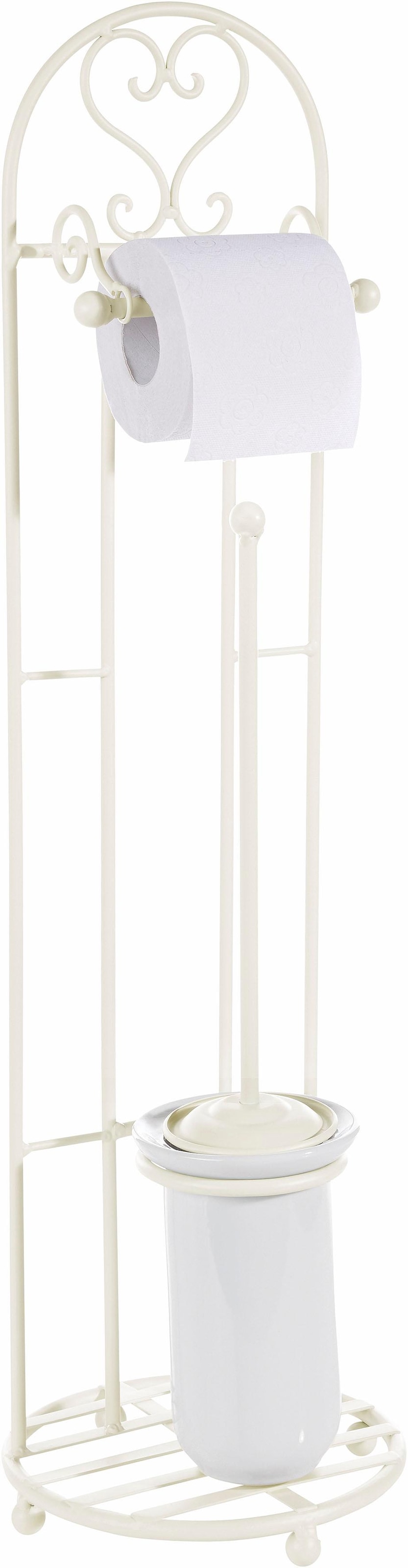 Mit einem Hauch von Nostalgie bereichert der Toilettenpapierständer »Antik« von Ambiente Haus das Bad oder Gäste-WC. Er zeichnet sich durch die formschöne Gestaltung im Landhausstil aus. Das unifarbene Gestell besteht aus geschwungenen Streben. Ausgestattet ist der Toilettenpapierhalter mit einem Rollenhalter und einem Bürstenhalter aus Keramik. Die passende WC-Bürste befindet sich ebenfalls im Lieferumfang. Dabei kann das Badaccessoire dank seiner kompakten Maße auch in kleineren Räumen genutzt werden.