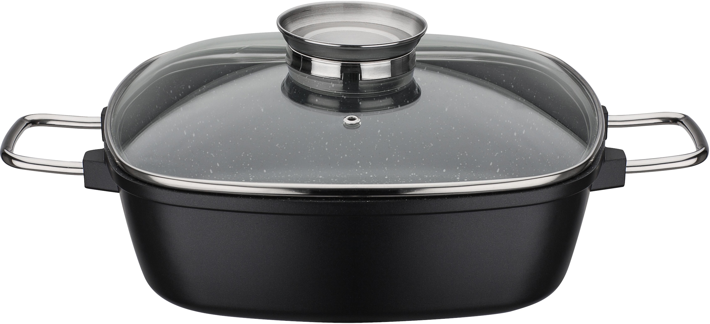 GSW Viereckbräter „Gourmet Granit“ aus hochwertigem Aluminium-Guss mit mehrfacher, langlebiger Antihaft-Versiegelung in modernem Granit-Design. Glasdeckel mit Aromaknopf zum praktischen Beträufeln des Bratgutes mit z.B. Wein. Robuste Edelstahl-Drahtgriffe. Energiesparender, extra starker FerroTherm®Boden für optimale Hitzeverteilung auf allen Herdarten. Backofengeeignet bis 240°C. Spülmaschinengeeignet.