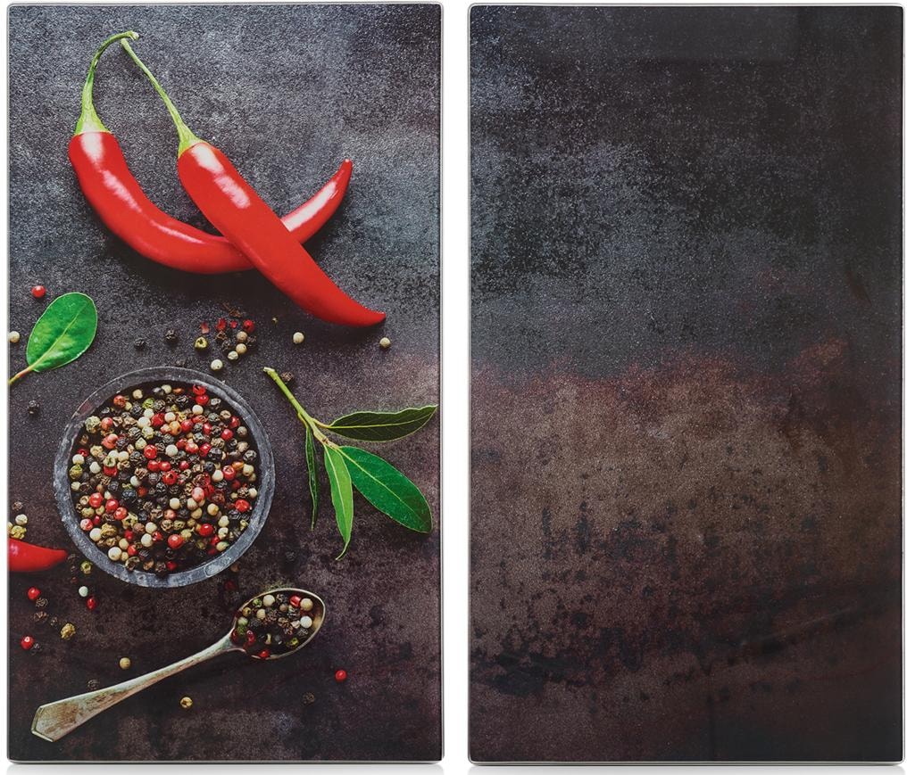 Diese modernen Platten sind aus ESG-Sicherheitsglas hergestellt. Sie können sowohl als Herdabdeckung als auch zum Schneiden verwendet werden. Sie überzeugen nicht nur durch ihre Funktionalität, sondern auch durch ihre Optik. Die Herdabdeck-/Schneideplatten stellen Ihnen zusätzlichen Arbeitsplatz zur Verfügung und schützen zugleich Ihr Kochfeld. Die Silikonfüße geben den Platten extra Halt und einen rutschfesten Stand beim Zubereiten und Schneiden. Sie sind nahezu unzerbrechlich und hitzebeständig, trotzdem empfehlen wir Ihnen, diese nur auf abgekühlten Kochfeldern zu verwenden. Hitzebeständig bis 220/240°C. Die modernen Haushaltshelfer sind abwaschbar, hygienisch und äußerst schnittfest. Mit ihrem hochwertigen, farbenfrohen Druck bringen sie zusätzlich Farbe in jede Küche. Gr. 56x50 cm als Herdblende einsetzbar.