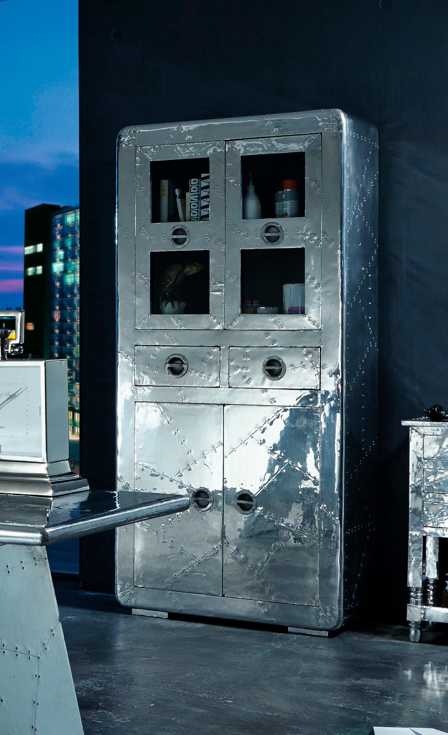 Für ein außergewöhnliches Flair im Zuhause sorgt die Vitrine »AIRMAN« von SIT im extravaganten Design. Sie begeistert in moderner Flugzeugoptik und ist von Hand mit Alu beschlagen. Schöne Metallgriffe runden die Gestaltung ab. Die Standvitrine ist mit mehreren Türen versehen, hinter denen sich reichlich Platz für Gläser, Bücher und andere Dinge befindet. Die Schubkästen bieten weiteren, nützlichen Stauraum. In puncto Qualität erfreut der Vitrinenschrank mit einer hochwertigen Verarbeitung und ist FSC®-zertifiziert.