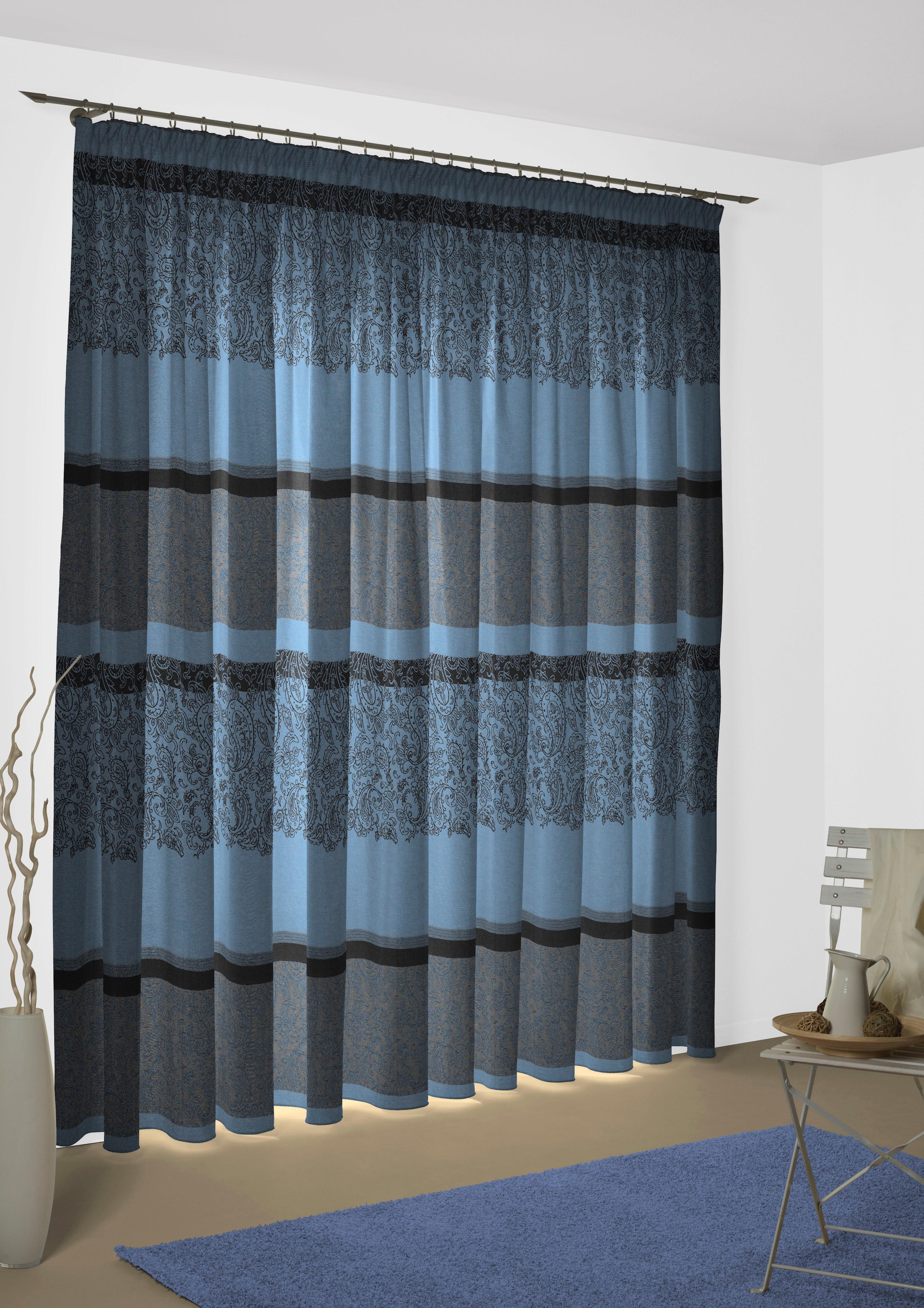 | Hinweis Dekoration | Die angegebenen Maße sind Stoffmaße.;Am Fenster fertig dekoriert, reduziert sich die Breite um ca. die Hälfte. |