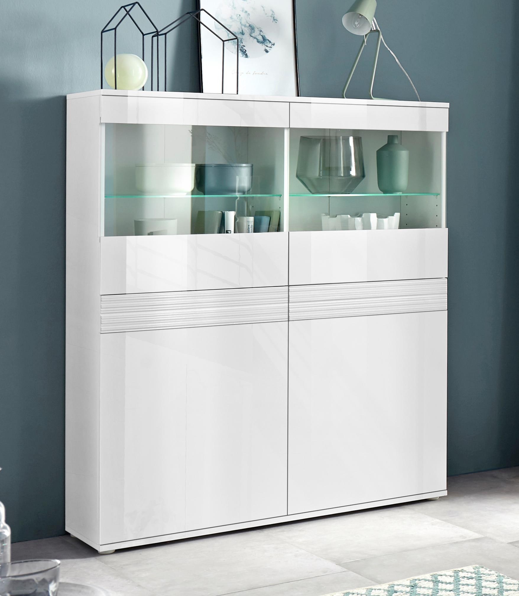 Wissenswertes  | Diese elegante Vitrine ist ein echter Hingucker! In tollen Farbdekoren bietet sie viel Platz für Ihre persönlichen Dinge. Die zwei Holz- und Glastüren werden mit Hilfe der Push-To-Open Technik bequem geöffnet. Das Highlight dieser Vitrine stellen die Riffeloptik-Absetzungen in MDF-Hochglanz dar, die bei den beiden Türen zu sehen sind. Die sichtbare weiße Front ist hochglänzend. Die stahlfarbene Front ist matt. Bei den weißen Ausführungen ist der Oberboden und die Außenseiten hochglänzend.       In folgenden Farben erhältlich: