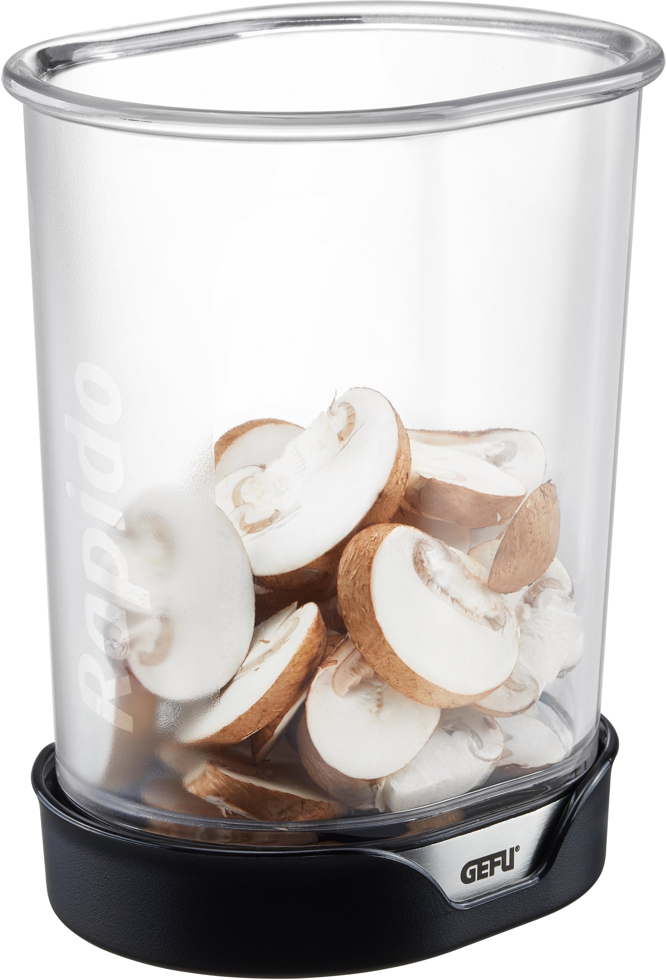 Der Scheibenschneider »RAPIDO« von GEFU liefert schnell und mühelos gleichmäßige Scheiben aus Obst und Gemüse: Schneidgut einfach auf ein Schneidbrett legen, den Behälterboden entfernen und den transparenten Auffangbehälter mit seinen scharfen Klingen draufdrücken: Fertig. Die Scheiben werden im Auffangbehälter gesammelt. Um eventuell zwischen den Klingen klemmende Reste zu entfernen, einfach den schwarzen Behälterboden aufsetzen, da er gleichzeitig als »Auswerfer« fungiert. Details: Gezahnte Spezialmesser aus japanischem Klingenstahl. Transparenter, ergonomisch geformter Auffangbehälter für direktes Sammeln der Obst- und Gemüsescheiben. Festzuklemmender Behälterboden gleichzeitig Auswerfer für Lebensmittelreste zwischen Messerklingen. L 10,5 cm, B 7,8 cm, H 12 cm. Hochwertiger Edelstahl / Kunststoff. Spülmaschinengeeignet.