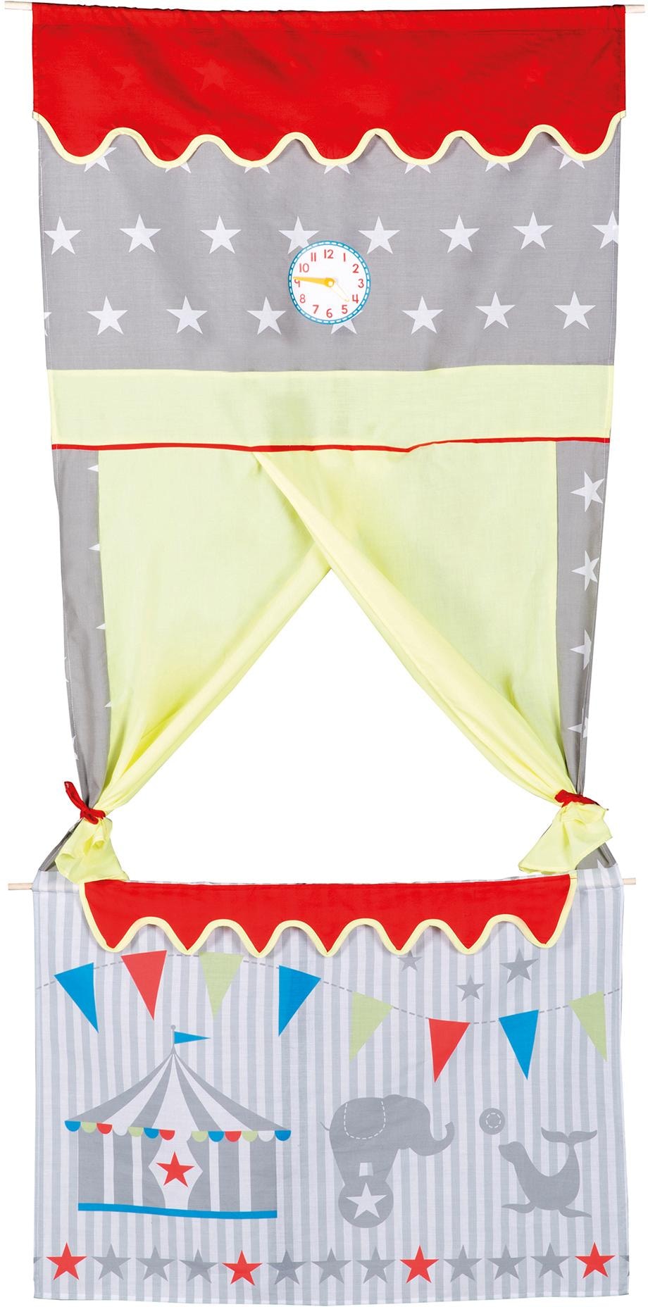 Vorhang auf für Kasperle und seine Freunde - Mit dem »Türkaspertheater« von Roba kann das Kind kleine Theaterstücke aufführen und in immer neue Rollen schlüpfen. Das Kasperletheater ist stilecht mit Zirkusmotiven ausgestattet und in modernen Farben gehalten. Eine Uhr zum Anzeigen des Vorstellungsbeginn ist ebenfalls enthalten. Das platzsparende Kaspertheater zum Aufhängen lässt sich mit der Holzstange und Schnur leicht an jedem Türrahmen befestigen. Die textile Ausstattung ist in der Maschine waschbar. Das Tür-Kasperletheater von Roba bietet vielfältige Rollenspiele und ein pädagogisches Spielerlebnis für Kinder. Maße (B/T/H): ca. 78/1/175 cm. Farbenfrohe Gestaltung im Zirkusdesign. Mit Vorhängen zum Aufbinden. Holzstange zur Aufhängung am Türrahmen. Uhr mit beweglichen Zeigern. Platzsparend verstaubar. Waschbar. Altersempfehlung ab 3 Jahren. Warnhinweise: ACHTUNG! Nicht geeignet für Kinder unter 3 Jahren. Verschluckbare Kleinteile.