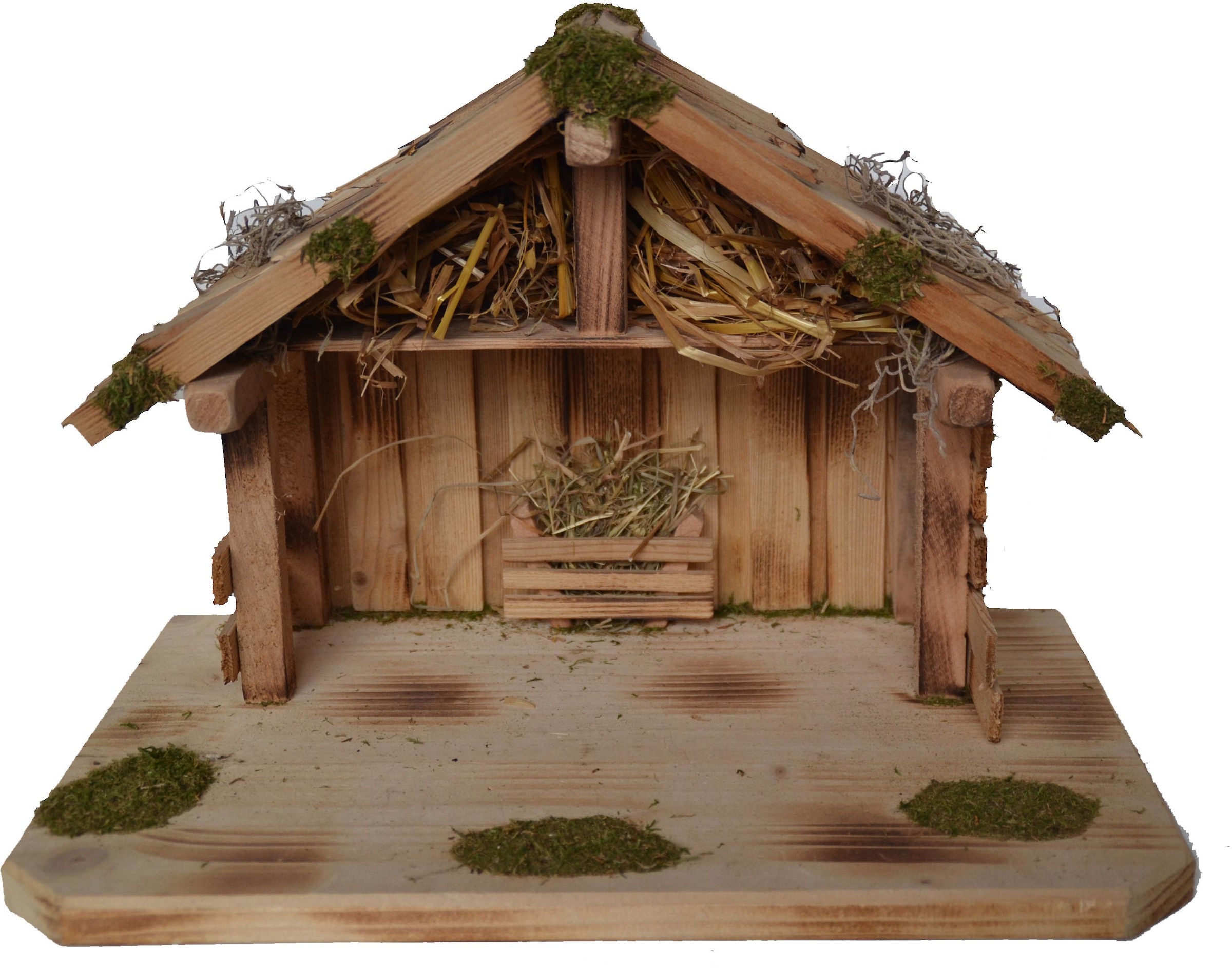 Diese Krippe wurde aus echtem Holz gebaut und mit Moos, Heu und Stroh dekoriert. Der überdachte Bereich in der Mitte bietet Platz für die Hl. Familie, Ochs und Esel sowie noch für weitere Figuren. Auch ist hier schon Heu für die Tiere vorhanden. Die Krippe ist für Krippenfiguren mit einer Höhe bis 9cm besonders gut geeignet.