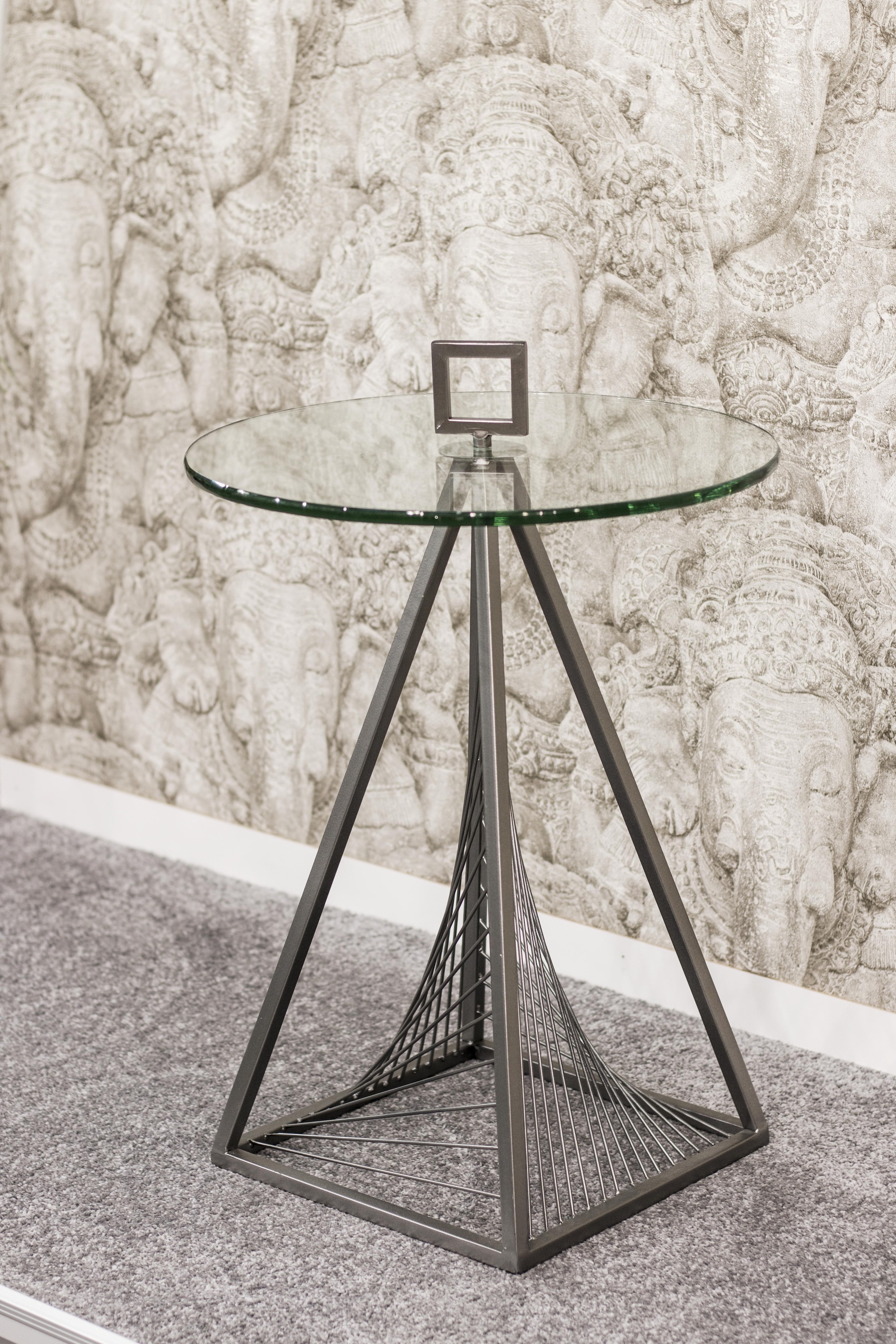Kleinmöbel mit Charme: Der Beistelltisch von HAKU mit Griff begeistert durch seine extravagante Formgebung. Das aufwendig verzierte Gestell hat die Form einer Pyramide, während dazu die runde Tischplatte kontrastiert. Daneben ist das Design durch den Materialmix von Metall für das Gestell und Glas für die Tischplatte geprägt. Eingesetzt werden kann der Tisch im gesamten Wohnbereich: Im Wohnzimmer lässt er sich neben dem Sessel oder dem Sofa platzieren, um darauf die Kaffeetasse oder Gläser abzustellen. Im Schlafzimmer kann das Möbelstück als Nachttisch dienen. Aufgrund seines Design setzt der Beistelltisch von HAKU mit Griff im gesamten Wohnbereich einen eleganten Akzent.