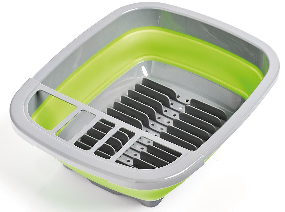 Dieser moderne Abtropfkorb verleiht in frischem Grasgrün ihrer Küche das gewisse Etwas. Doch nicht nur das, er ist dank des faltbaren Mittelteils praktisch und vor allem platzsparend. So findet unser Abtropfkorb mit integriertem Besteckkasten auch in der kleinsten Küche seinen Platz!