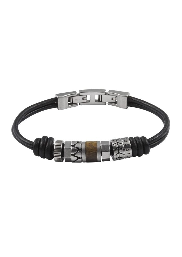 Die Verbindung natürlicher Materialien und moderner Formen in Kombination mit Holz stehen für den typischen Fossil-Naturally-Modern-Look. Das Armband aus schwarzem Leder hat eine Länge von ca. 22 cm und lässt sich in der Länge verstellen. Die 6 matten Edelstahlelemente und 1 Edelstahlelement mit Holz kombiniert geben diesem Herrenarmband seine besondere Note.