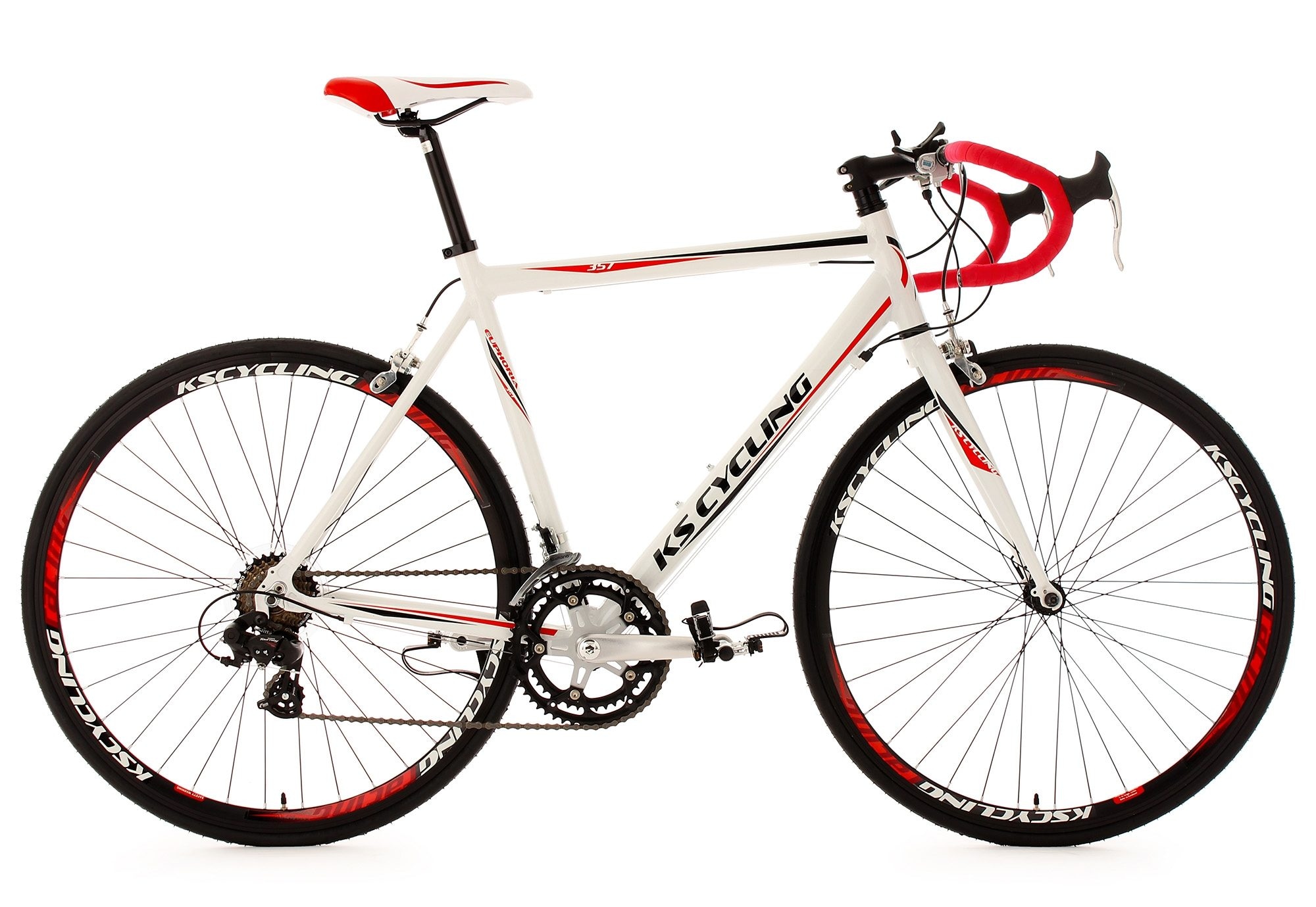 Das Rennrad Euphoria mit 28 Zoll-Laufrädern ist das ideale Gefährt - egal ob Einsteiger, Freizeitfahrer oder Wiedereinsteiger. Hier passt alles zusammen: Das frische, sportliche Design ziert nicht nur den Aluminiumrahmen. Sattel und auch Felgen fügen sich nahtlos in den Racing-Look ein, der mit dem roten Lenkerband abgerundet wird. Tolle Komponenten wie Aluminium-Rahmen, SHIMANO 14-Gang-Kettenschaltung, Pedale mit Haken und Riemen ergänzen die Optik perfekt.