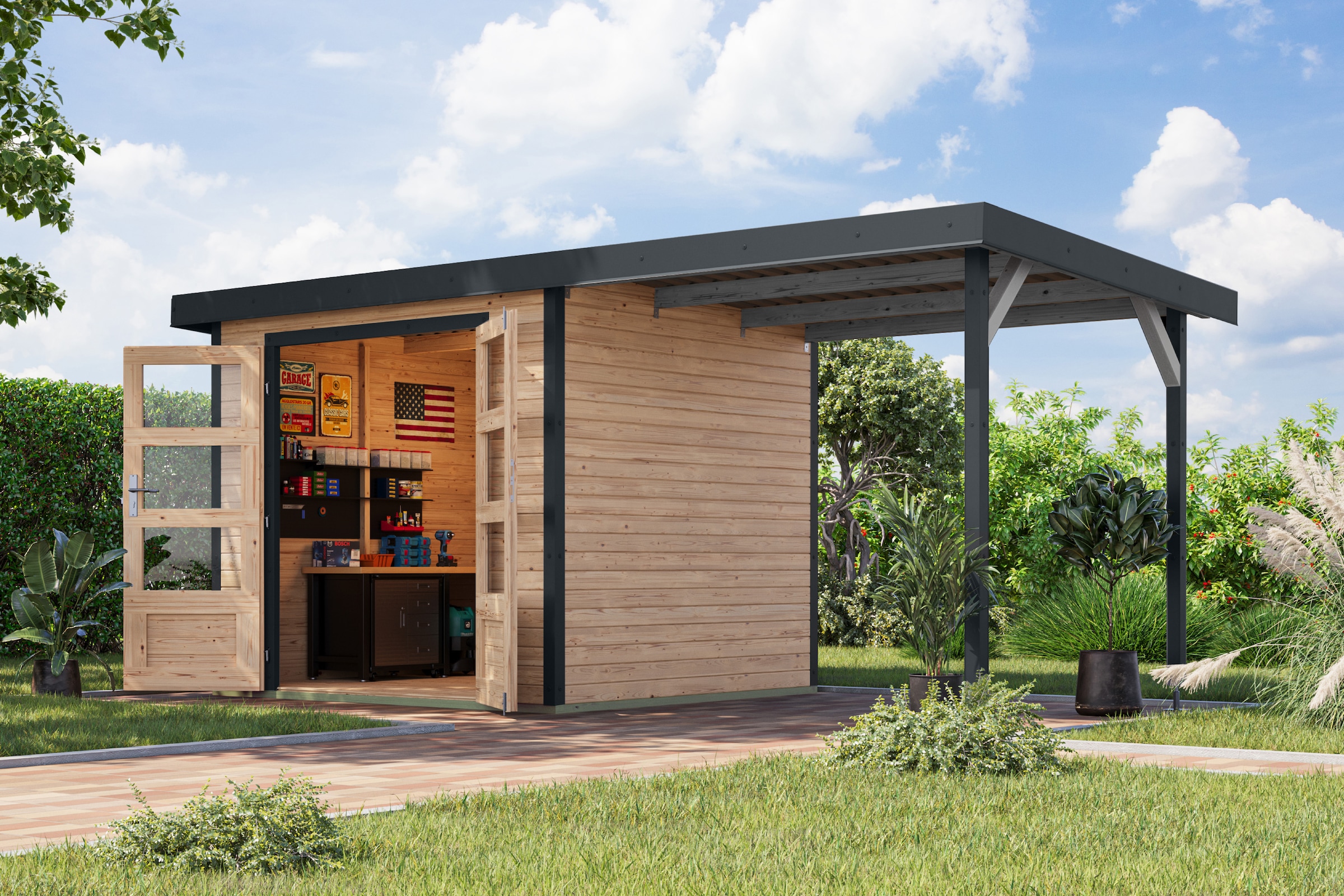 - Gartenhaus »"Arnis 5" SET anthrazit mit Anbaudach 2,40 m Breite« aus hochwertiger...KaribuAktueller Preis2.223,57 €