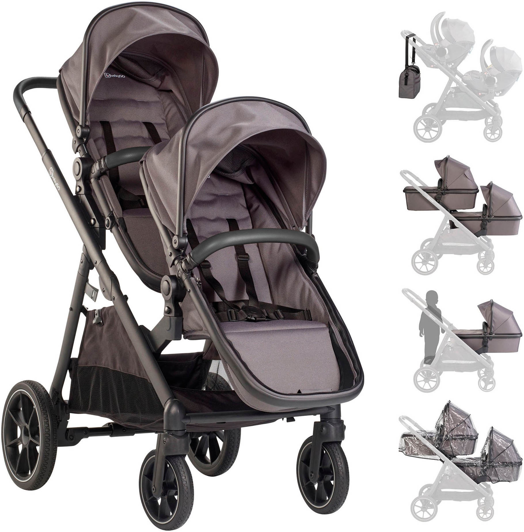 - Zwillings-Kombikinderwagen »Duo, grau« inkl. Wickeltasche u. 2 RegenhaubenBabyGoUrsprünglicher PreisUVP 899,00 €Rabatt- 396,47 €Aktueller Preis502,53 €