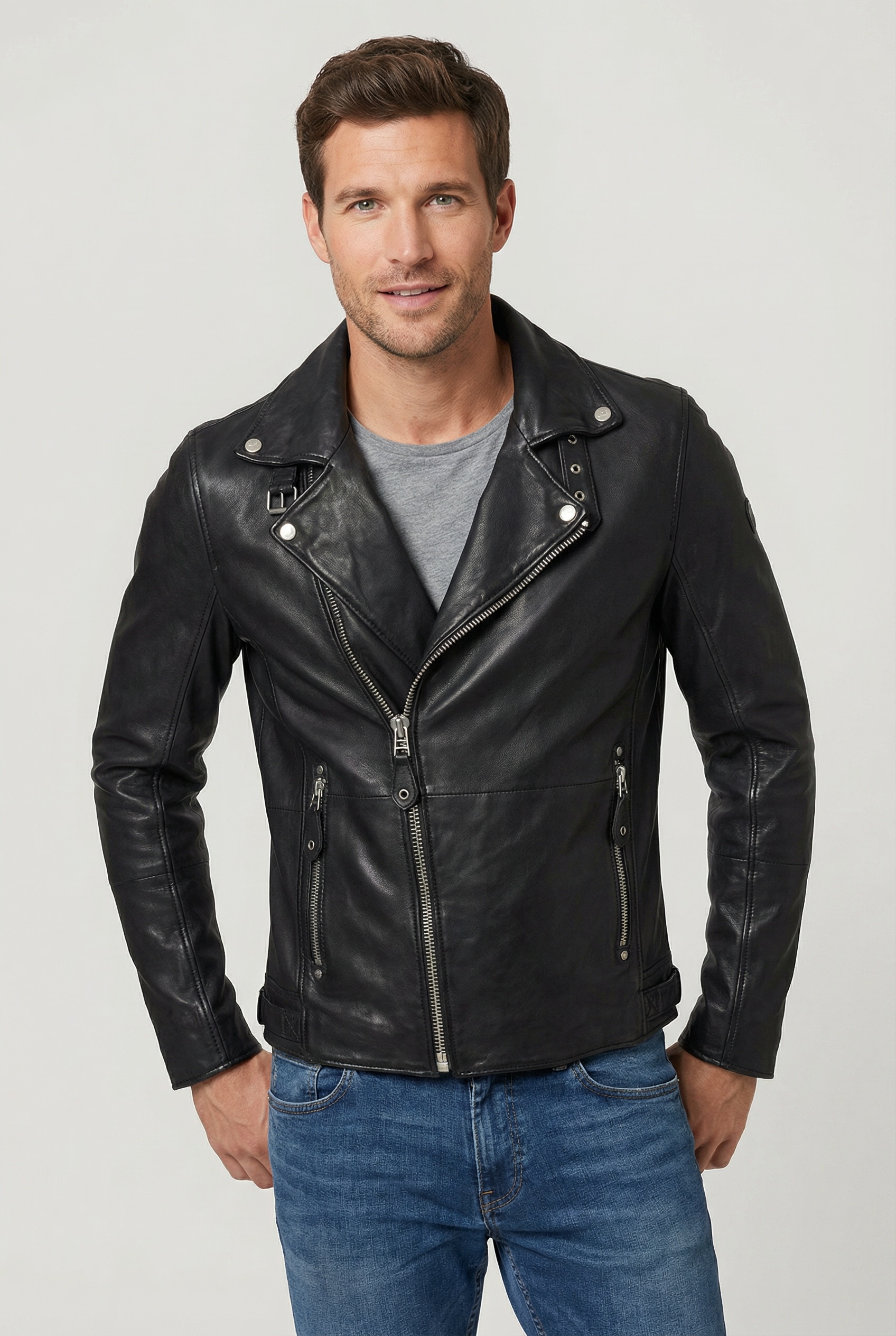 - Lederjacke »Mavric SF NSLV« im Biker-Style, asymetrischer Reißverschluss, NietenMauritiusUrsprünglicher PreisUVP 229,90 €Rabatt- 14 %Aktueller Preis195,99 €