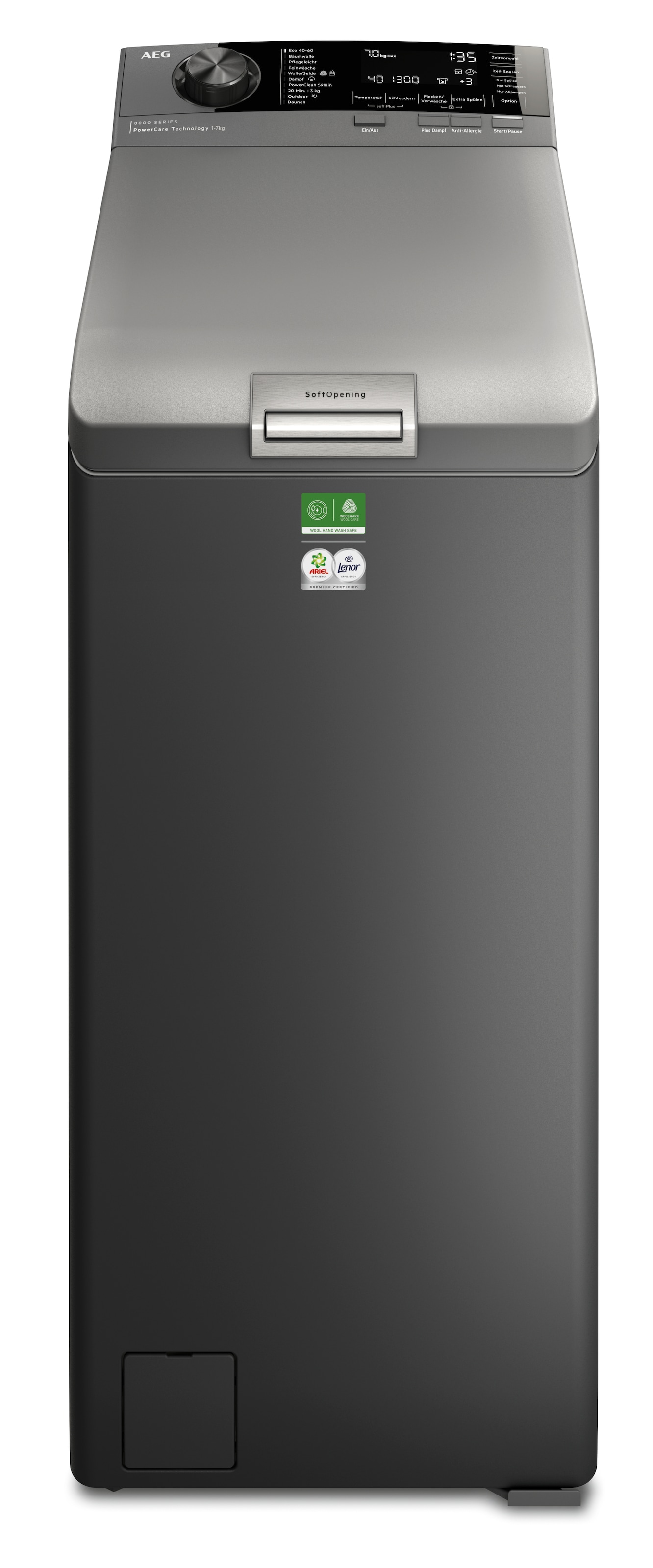 - SOFTOPENING – Der Trommeldeckel öffnet sich sanft per Knopfdruck für bequemes Be- und Entladen