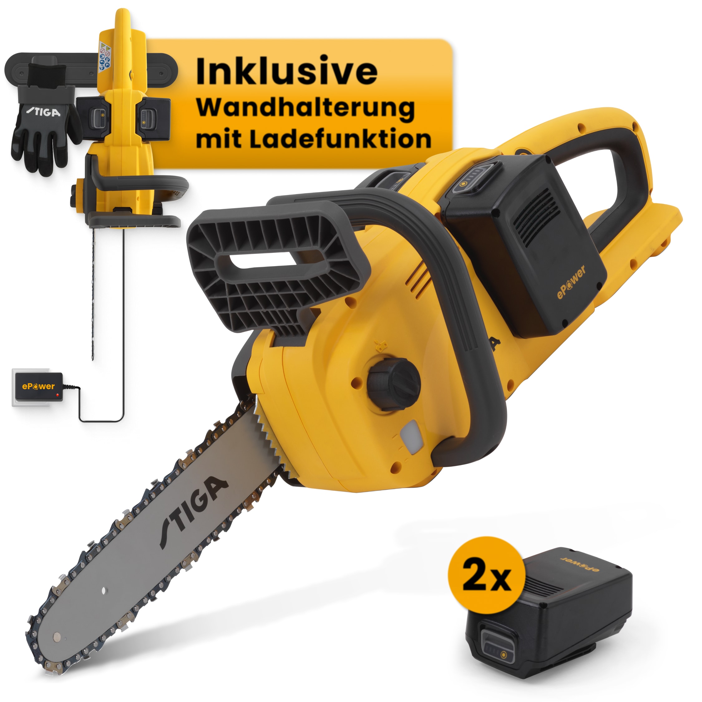 - Inklusive STIGA 2x Akku E 24 (20 Volt 4 Ah) und Doppel-Ladegerät