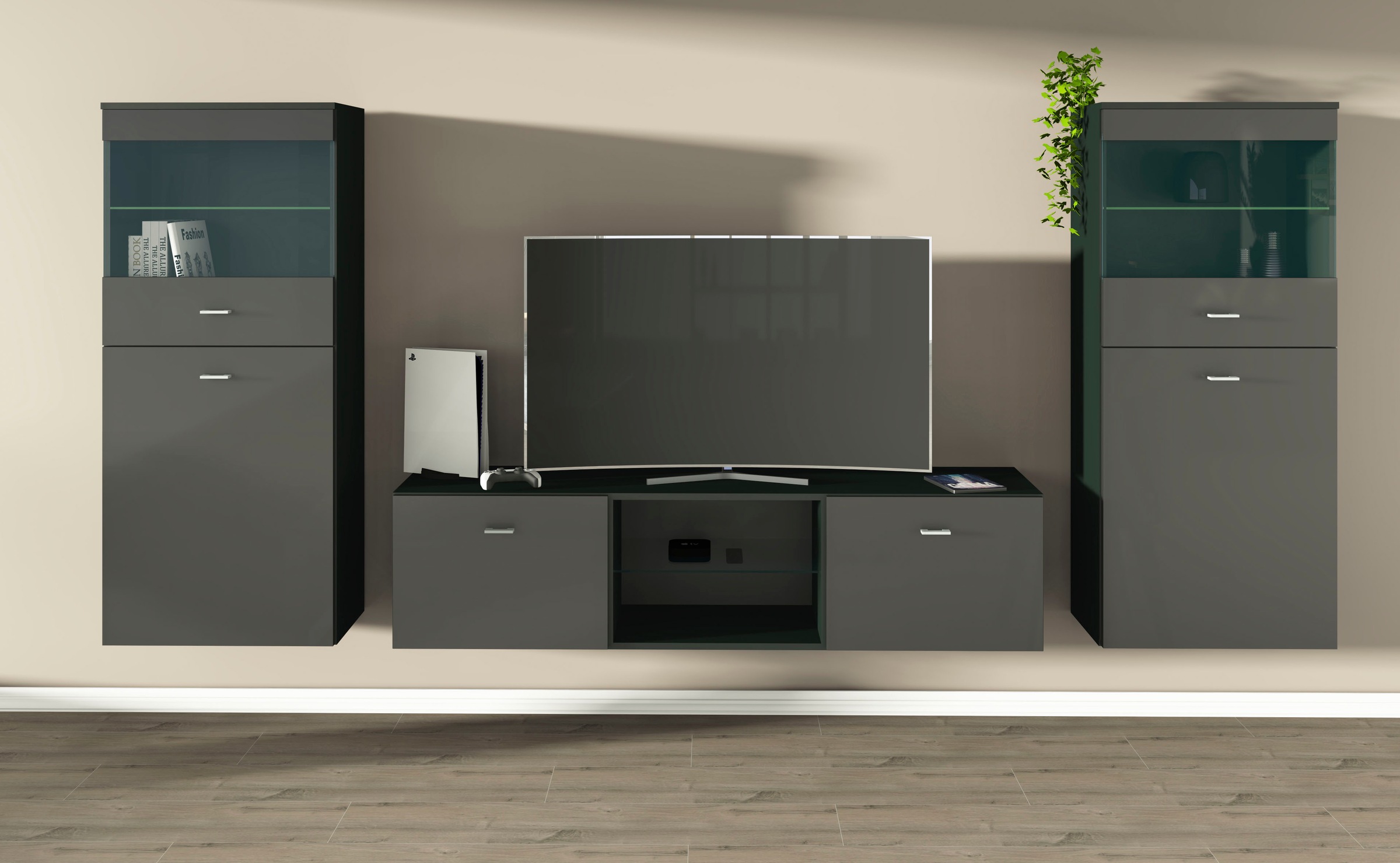 Die schwebende Wohnwand bietet zudem den Vorteil, dass sie den Boden freihält. Dies macht sie ideal für kleinere Räume oder Räume mit komplexem Layout, da sie optisch Platz schafft und den Raum größer und offener wirken lässt. Gleichzeitig bietet sie aber ausreichend Stauraum, um alle deine Dinge ordentlich und übersichtlich zu verstauen.